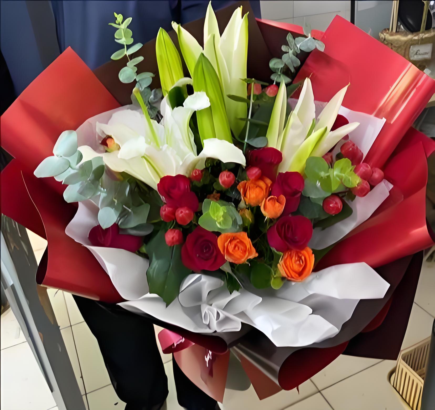 大连长海县花店包11枝红玫瑰、2枝多头白百合、6枝橙色多头玫瑰、红豆、尤加利叶